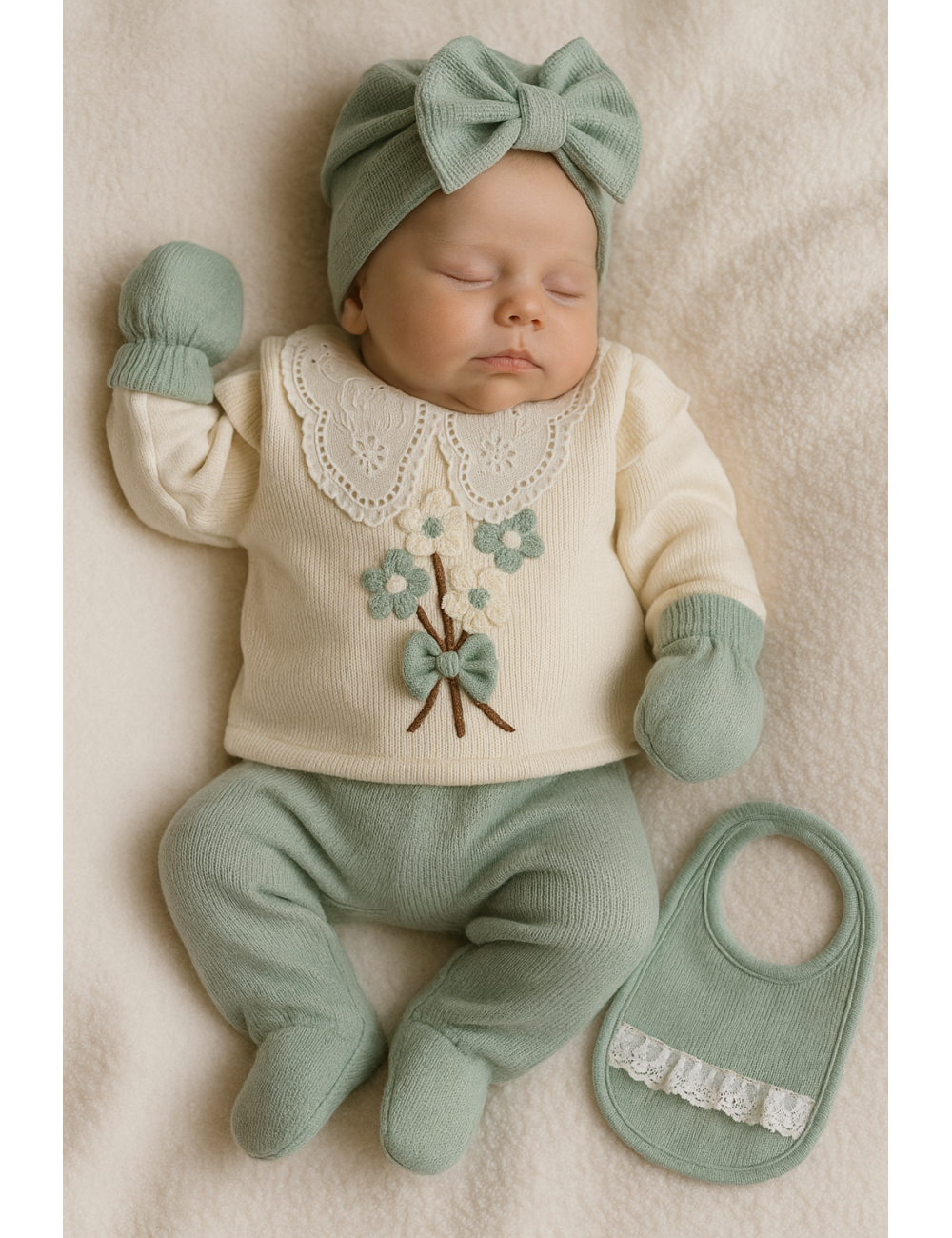 Un assortiment complet en 5 pièces avec haut, pantalon, moufles, bavoir, et bonnet