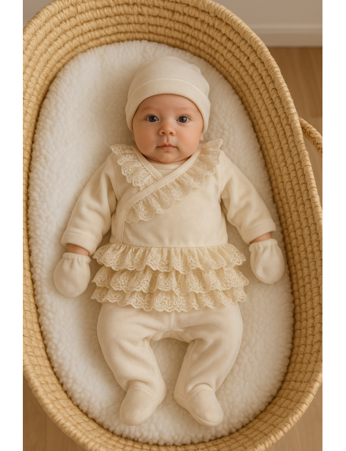 Un ensemble pour bébé comprend un haut, un pantalon, des moufles et un bonnet assorti. cet ensemble assure la chaleur et la liberté de mouvement pour le bien-être du bébé, tout en facilitant l'habillage pour les parents.