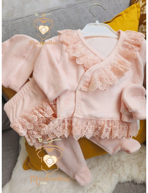 Un assortiment complet en 5 pièces avec haut, pantalon, moufles, bavoir, et bandeau |