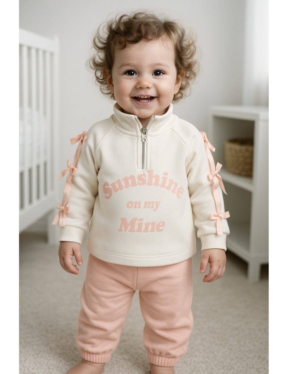 Un assortiment complet en 5 pièces avec haut, pantalon, moufles, bavoir, et bandeau |