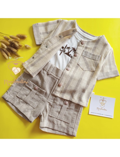 Un ensemble comprend un body, une chemise, et un short |