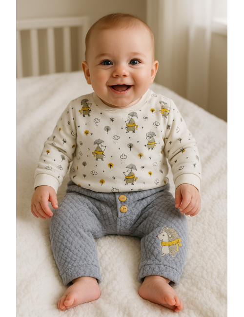 Un ensemble pour bébé comprend un haut, et un pantalon. Fabriqué dans des tissus doux, cet ensemble assure la chaleur et la liberté de mouvement pour le bien-être du bébé, tout en facilitant l'habillage pour les parents.