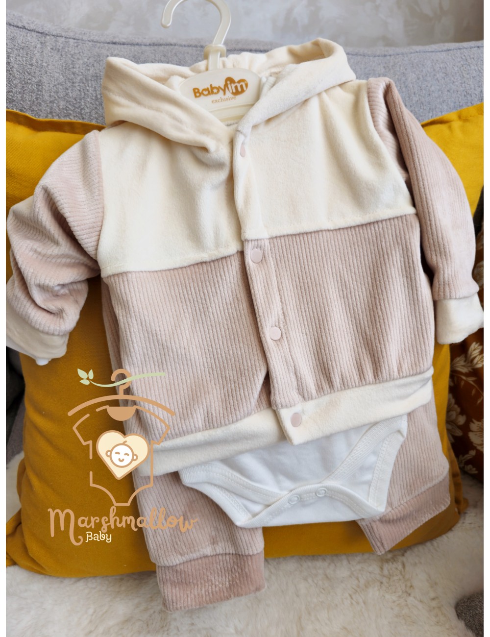 Un ensemble velours comprend un body coton, pantalon et jacket en velours