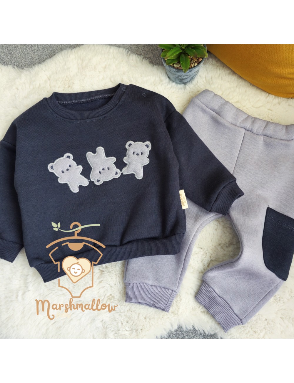 Un assortiment complet en 5 pièces avec haut, pantalon, moufles, bavoir, et bonnet |