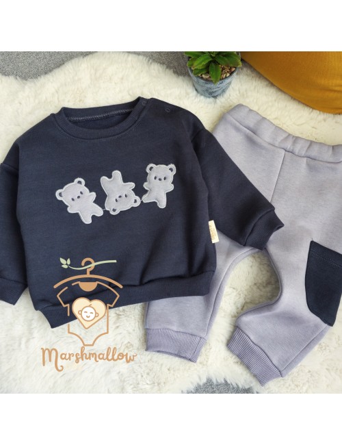 Un assortiment complet en 5 pièces avec haut, pantalon, moufles, bavoir, et bonnet