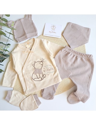 Un assortiment complet en 5 pièces avec haut, pantalon, moufles, bavoir, et bonnet