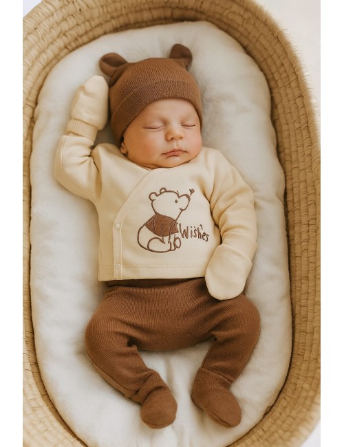Un assortiment complet en 5 pièces avec haut, pantalon, moufles, bavoir, et bonnet |