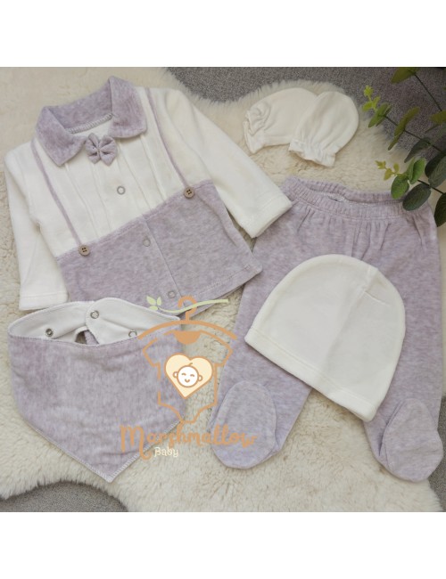 Un assortiment VELOURS en 5 pièces avec haut, pantalon, moufles, bavoir, et bonnet